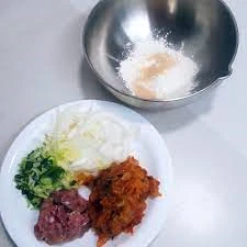 - 다진 김치와 계란을 반죽에 넣고 골고루 섞어줍니다. 소금과 후추로 간을 맞춰줍니다.